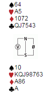 En liten kløver kom ut til syd. Ruter til kongen vant neste stikk, og da fulgte liten ruter fra nord. Nå la øst liten, og da krevde åtteren vests ess. Det ville vært bedre motspill av øst å legge i en stor ruter. Da vil fortsatt en meget interressant utvikling skje, men de variantene kan du få pusle litt med selv. Den enkleste måten å bete 4 spar på er å spille ut hjerter til esset og mer hjerter. Da får forsvaret tak i to stikk i den fargen samt ruter ess, og spillefører har ingen mulighet til å få til noe lignende som du her skal få se skjedde. Etter ruter til kongen gikk det altså ruter til åtteren og esset. Vest skiftet til hjerter til østs ess. Derfra kom kløver til syds andre honnør. Saur tok for ruter dame og kastet en hjerter fra nord. Så den fjerde ruteren. Vest kastet en kløver og nord kunnes trumfe. Så ble nords tredje kløver trumfet hos syd, og dette var igjen: