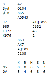 Når man har en nikorts tilpasning sitter den fargen fordelt 3-1 eller 2-2 i litt over 90% av tilfellene. Men sannsynlighet og prosenter hjalp ikke her, nord var utstyrt med sikkert trumfstikk - en bet etter ruterutspill.