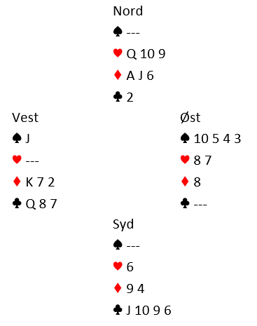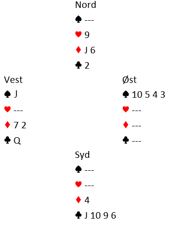 På hjerter 9 må vest kaste spar knekt. Så får han for kløver dame bare for å være nødt til å spille ruter, og avslutningen blir en lekker finesse med ruter 6!