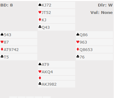 Jeg tenkte i alle fall at jeg ikke kunne ha bedre kort siden jeg hadde en passet hånd. Det MÅ simpethen være spill for 7 kløver som ble hva jeg meldte. Det var spill for 7 kløver, men det var ikke den optimale kontrakten: