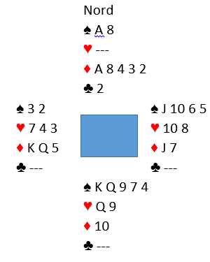 Å spille motspill mot 2 hjerter doblet ville vært å foretrekke fremfor slik det ble, motparten "off the hook" da jeg sa 2 ruter . Ved det andre bordet ble det spilt 2 hjerter doblet -500 som nesten var det minste N/S kunne få, og øst skal ikke gjøre mye galt i den kontrakten før han går 800 ned. Motparten vår var kommet seg unna og kontrakten ble 3 grand av nord. Øst spilte ut hjerter knekt til kongen, og vest gikk nesten i koma (5 minutter) før han stakk med esset. Det var nok ikke det beste, hvis han legger lavt ser det veldig vanskelig ut å vinne 3 grand. Inne på hjerter ess gikk vest i tenkeboksen igjen før han skiftet til kløver ess. Det er i alle fall bedre motspill enn liten kløver som sikkert var et alternativ for han (husk han ser ikke nords kort, bare knekten singel i kløver hos syd). Med liten kløver i skift vinner knekten stikket, og da er det bare å gi bort et par ruterstikk. Konge-dame i kløver er behagelige stoppere. Etter kløver ess kom kløver 6 fra vest. Da innså jeg at det ikke ville føre frem å gå for ruterfargen lenger, for forsvaret vil rekke få to kløverstikk som sammen med to ruterstikk og hjerter ess gir beten. Så jeg la kløver 7, og øst vant stikket før han fortsatte med kløver. Dermed var det tre kløverstikk hos nord som sammen med tre sparstikk, ett i hjerter og ruter ess er åtte stikk. Og nå var øst i trøbbel. På den fjerde kløveren kunne han kaste en hjerter, men idet den siste kløveren kom fra nord så det slik ut: