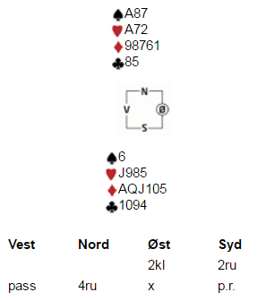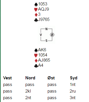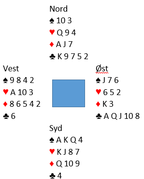 Espen var i 3 grand som nord etter at syd hadde åpnet (med 1 ruter, Ø/V spilte Presisjonskløver). Samme kontrakt ble spilt ved det andre bordet, og begge steder kom kløver dame i utspill vunnet av nords konge. Hjerter ess ble presset ut, ved Espens bord lå vest unna to ganger, men vant med esset i fargens tredje runde. Så kom ruter fra vest. Da var gode råd dyre. Hvis ruterspillet slippes vinner øst med kongen og tar beten med tre kløverstikk. Espen suste opp med ruter ess og spilte spar 10. Nå satt nok øst og halvsov, for han dekket ikke tieren! Da lot Espen spar 10 seile, og simsalabim, da var det fire sparstikk og ni i alt (4+3+1+1). Pluss 600.