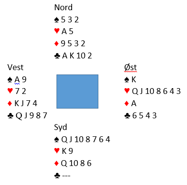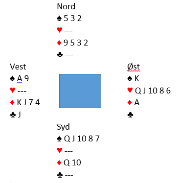 Nå spilte han trumf og Ø/V var sjanseløse. Ruter ess singel blokkerer. Øst får for spar konge og tar for ruter ess, men så må han spille hjerter til dobbeltrenons, og syds fjerde ruter forsvinner. Pent spilt av Scwartz, +620, men dette kunne vel godt skje ved det andre bordet også?
