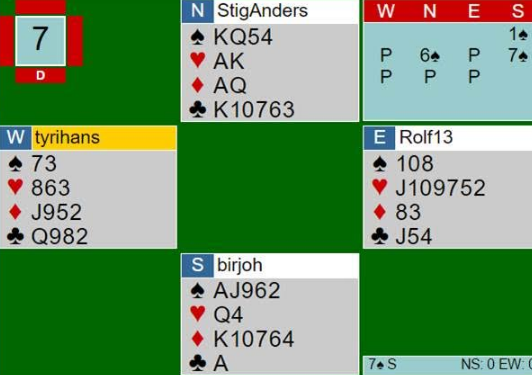 Øyvind valgte først å kvitte seg med rutertaperen, fortsatte derfor med sp til K og D med sak av ru 4. Så tok han simpelt hen for hj A og spilte mer trumf. Øst fikk for hj D og spilte ruter til esset, men da kunne Larsen vinne, stjele en ruter, spille kløver til kongen og kløver knekt til esset før ny kløver til røff felte damen i Øst. Siste ruter til stjeling og stående kløver nøytraliserte hj K som hadde sittet tredje i Vest. 11 stikk og delt topp siden hj 10 i bordet ville forfremmes til stikk.