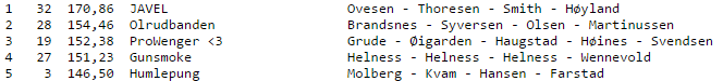 Mandag ble lagturneringen avsluttet. Den ble soleklart vunnet av et lag som kalte seg JAVEL, bestående av Siv Thoresen, Vidar Smith, Jo Arne Ovesen og Sven Olai Høyland.