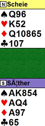 Hjerter til esset og dame fra Nord før ny hjerter ble stjålet med ru K. På kl A og K stypte damen fra Vest med Eriksen kunne da stjele kl 5 med esset og trekke ut trumfen og forlange resten. +1540. Og de var alene om å melde disse to gode lilleslemmene!
