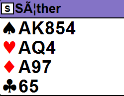 1 sp fra Nord med svar 2 hj fra Syd. Tormod valgte å kreve med 4 ruter og da gikk Gunnar på med 4 NT og da makker hadde to ess ble sluttbudet 6 grand. Hjerter ut hadde vært pinibelt, men da ru 7 ble spilt kunne Syd i 2. stikk sikre kontrakten med liten kløver mot knekten. Øst hadde sp J7653- hj D75- ru 1087- kl 872 og klandres ikke for ikke å spille hjerter opp mot Bergmanns 5+ korts farge. +990.