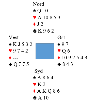Etter at den norske vest hadde vært inne med en sparmelding meldte Danmarks N/S seg opp i 6 hjerter som skulle spilles av nord. Da doblet vest. Doblingen er Ligthner, dvs ber makkeren om ikke å spille ut det naturlige som etter sparmeldingen fra vest er sparutspill. Vest ville selvsagt ha ruter ut til stjeling. 6 hjerter kan nok vinnes selv med det utspillet ved å gjette hjerteren, men etter å ha blitt doblet flyttet syd til 6 grand!