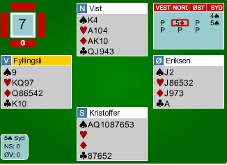 Mange svarer nok hjerter konge temmelig automatisk på spørsmålet mitt om utspill. Det ser opplagt ut, men det er vel bare hvis man kun ser på egne kort og ikke lytter til meldingene? Hvis en tar hensyn til meldingene så tyder svært mye på at N/S mangler kløvrekontroll, men de har "resten". Er ikke kløver konge i utspill fristende da? Hvis vi har - som du tror - to kløverstikk å ta, kan det vel hende verken nord eller syd har dobbelton, og vi kan kanskje bete 5 meldingen med to kjappe kløverstikk og en tredje runde kløver til stjeling?