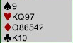 Makkers 5 ruter må være kontrollmelding. Vi flytter aldri kontrakten fra utgang i major til 5 i minor når åpneren har vist (som regel) åttekorts farge. Så ny farge er kontroll i fargen og sleminvitt i spar. Hvorfor meldte ikke makker 4 grand for å spørre etter Key-Cards? Fordi han mangler en kontroll i en farge, og det er (selvsagt) kløver som er det svake punktet. Siden makker går på til femtrinnet UTEN kontroll i kløver må han ha alt som behøves i de andre fargene, hvis ikke kan jo godt sett fra hans side 5 spar gå bet hvis også åpneren mangler kløverkontroll. Her hadde ikke åpneren noe problem, han måtte slå av i 5 spar siden også han manglet kløverkontroll. Da passet nord, og de skulle spille utgangen sin på fem-trinnet. Disse meldingene bør også motspillerne merke seg. Hva ville du spilt ut mot 5 spar med disse kortene?