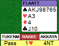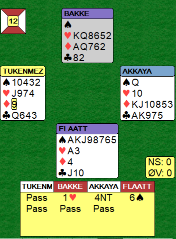 Ved det andre bordet var tyrkerne i 4 spar. Bakke spilte ut sin single kløver til nieren, liten og liten. Spillefører startet med trumfen, men da den satt 4-1 innså han at det ikke var inntak til kløverfargen, så etter tre runder trumf spilte han kløver mot østs A-J. Bakke stjal (spillefører la da esset fra øst) og skiftet til ruter knekt som vant det stikket, så to ganger ruter til som vest måtte trumfe. Dermed var han uten trumf og uten inntak til vest, kløver knekt lå der og blokkerte den fargen. Till slutt fikk han en hjertertaper, en bet, og dette ga +12 IMP til Norge. Spillefører kunne nok gjort det bedre (for eksempel lagt kløver knekt i første stikk), men det spiller ingen rolle, +IMPS er +IMPs!