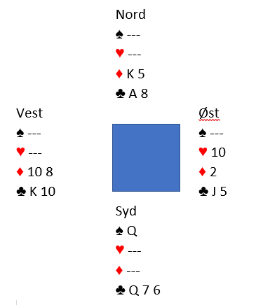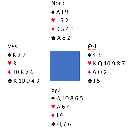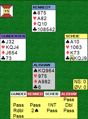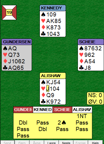 Den norske øst åpnet med 1 grand som makkeren passet på, og da N/S kom innpå og var i 2 spar gikk det pass rundt.