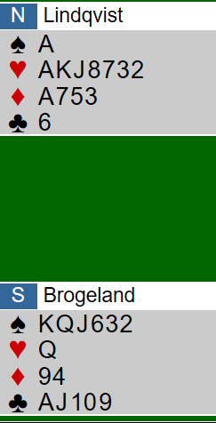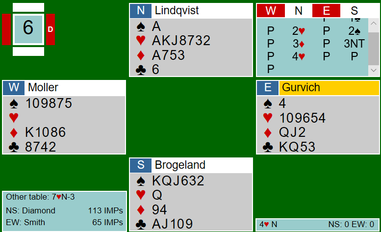 Levin (syd) passet, og etter pass fra vest også åpnet Weinstein (nord) med 3 ruter. Øst kan liksom ikke doble med singel spar og meldte inn 3 hjerter. Da syd smalt til med 5 ruter ble det riktig "tempo" på meldingsforløpet for N/S, mens Ø/V måtte ut å gjette. Vest sa 5 hjerter, og øst kunne ikke vite om det var basert i gode kort, eller om vest bare pushet da han støttet sin makker. Som du ser passet øst, og da de dermed hadde brent den opplagte slemmen var det 13 IMP i favør lag NICKELL.