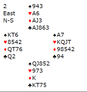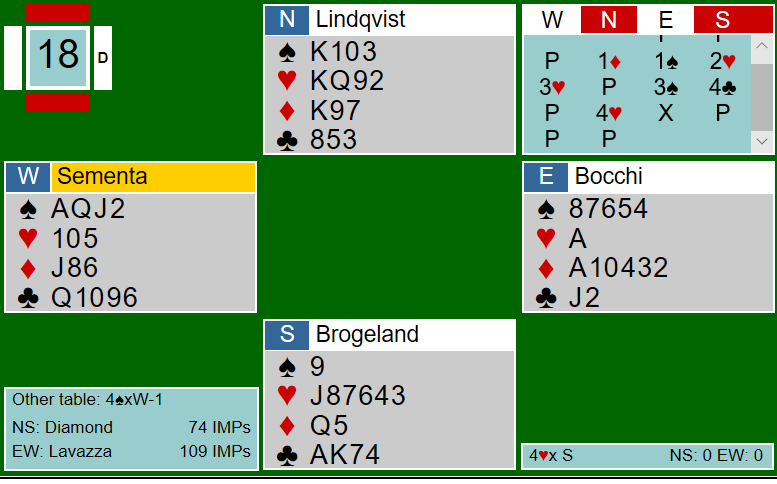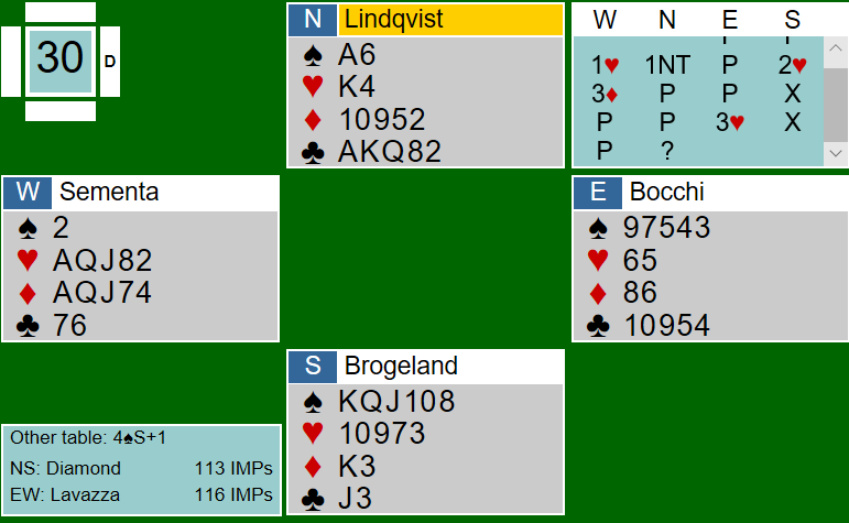 Det ser ut som om Sementa skal kunne skrape sammen seks stikk i 3 hjerter doblet. Det ville i så fall betydd +500 til DIAMOND, og det ville gitt kun 2 IMP, fortsatt 1 IMP bak etter siste spill. Men Sementa traff vel ikke helt i spilleføringen, og motspillet var godt. Det kom to ganger kløver ut og skift til spar ess og mer spar som vest trumfet. Så spilte han litt merkelig ruter til åtteren. (Det er litt uklart om BBO rapporteringen av spillets gang er helt korrekt, og det har jeg ikke rukket å få bekreftet) Boye vant med kongen og spilte spar, stjeling med åtteren og overstjeling med Lindqvists konge. Så kløver fra nord, og syd kunne kaste sin siste ruter. Dermed hadde ikke Sementa særlig kontroll over det her, og det endte med fire doblede bet, +800 til lag DIAMOND. Den fjerde beten var avgjørende, for nå ga spillet 8 IMP, og DIAMOND vant kampen med 5 IMP!