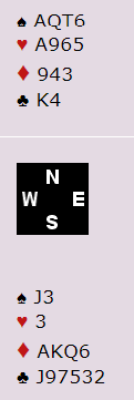 A1098, AK5,QJ72,K5 mot QJ, 2, 109865, QJ942. Vest åpnet med 1 NT og Øst meldte 2 spar = overføring til minor. Nå meldte grandåpneren 2 NT som viste bedre ruter enn kløver. Øst kom da i 3 ruter som var en stjernekontrakt. 10 stikk og 130 var mer verdt = +27, enn 1 beit = 22,4 i 7-hjerter i forrige spill. Delkontrakter teller i parturnering.
