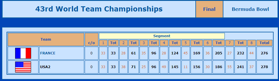 Fra den 6. av 8 segmenter i Bermuda Bowl- finalen mellom Frankrike og USA 2 var det stadige skiftninger. Ved start var da USA 2 et godt forsprang, men Frankrike tok raskt innpå og forbi.