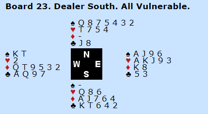 Ved det ene bordet så det ut til å bli enda et dårlig spill for Bulgaria da Ø/V lot New Zealands nord spille 2 spar med to bet, +200 til Bulgaria. Ø/V har nemlig 3 grand i kortene. Ved det andre bordet var New Zealand i noen sekunder i 3 grand som var kontrakten og ble vunnet ved begge bordet i finalekampen. Men så valgte Ø/V å melde 5 ruter i stedet, ikke noen suksess da den også ble doblet. Vest gikk kun en bet, men likevel +200 til Bulgaria og 9 IMP til dem. Det ga dem 9 IMP i stedet for 9 IMP andre veien hvis kiwiene stopper i 3 grand. Forskjellen? 18 IMP, og du husker kanskje marginen til slutt...16 IMP.