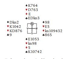 Løsningen er å satse på trumfen 3-2, da går det greit ved å ta to store spar. Så kjøres i gang med kløverfargen. Hvis vest trumfer må han spille hjerter som løser den fargen med kun to tapere, eller ruter til dobbeltrenons som gir stjeling på den ene siden og hjerteravkast fra den andre. La oss si vest ser det og nekter å trumfe. Den femte kløveren gir da avkast for en hjerter fra nord, men bare en. Dette blir igjen: