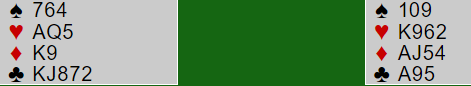 Steffen Fredrik Simonsen og en polakk med et navn jeg neppe klarer å stave riktig selv på flere forsøk satt øst. Steffen åpnet med 2 kløver. I andre melderunde har han et valg, vise hånden som 23(2)-24 grand, oppgradere til 25(4)-27 grand, eller melde sparfargen og da vise en mer ensfarget hånd, normalt. Her blir det litt ubekvemt å vise 24-27 (som man nok synes hånda er verd) hvis det i systemet er åpning 2 kløver fulgt av et hopp til 3 grand, for med dette kan det veldig godt være bedre i sparkontrakt. Spilles det med "Kokish" etter 2 kløver-2ruter får man (via 2H - kunstig) etter hvert vist den råsterke grandhånda med 2NT, og makker kan finne ut om grandhånda har femkorts major via Puppet Stayman.
