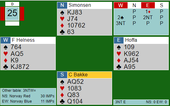 Steffen valgte å gjenmelde 2 spar. Christian meldte 3 hjerter som åpneren løftet til 4 hjerter. Det ville blitt sluttkontrakten om øst hadde vist grandhånd også, i såfall spilt av øst etter overføring. Det norske paret noterte +650, egentlig et normalt resultat på spillet som så slik ut: