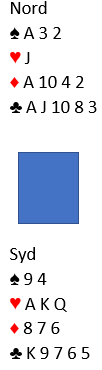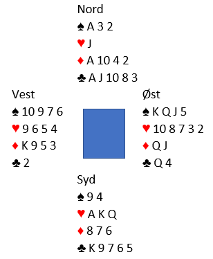 Tre runder hjerter tas med to sparavkast fra nord. Så stjeles syds siste spar, og situasjonen har blitt som den skal være, slik:
