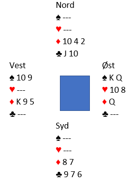 Vest spiller ut spar 10. Det ser temmelig dødt ut. Hjerterstikkene gir to avkast, men om det kastes ruter fra nord blir det igjen en spar- og en rutertaper. Og om det kastes to spar fra nord blir det ingen spartapere, men da ser det unektelig ut til å bli to ruterstikk til motparten. Eller?