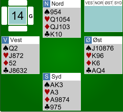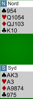 Forquet fortsatte med en tredje runde spar. Øst kunne ta tre sparstikk (syd kastet to kløver), men så måtte han spille hjerter, ruter eller kløver.