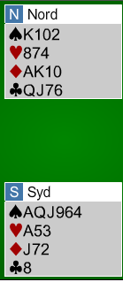 Syd er i 4 spar uten motmeldinger. Vest spiller ut kløver 10 til damen og østs konge. Derfra kommer hjerter dame tilbake. Det kan se ut som om det blir to hjertertapere slik at kontrakten er avhengig av ruterfinessen. Men det er kun om du ikke har fått med deg hvordan nords "små" kløver har vokset verdi. Ø/V har nå igjen kun esset og nieren i kløver, og det bør spillefører utnytte. Det han bør gjøre er helt gratis!