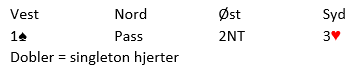 Videre har man en direkte melding fra vest over syds dobling. Kontrollmelding, ja, men sier det noe om «kløverproblemet»?