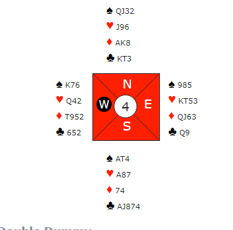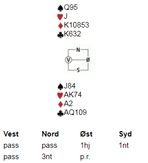 N/S havner i 3 grand over alt med slikt, de fleste med nord som spillefører. En dobbel dummy-analyse sier at det maksimale N/S kan vinne er ti stikk i grand. Men for at det skal skje må øst spille ut hjerter. Da må spillefører lasjere hjerter to ganger, så gjette kløveren og også gi bort ett stikk i spar via finessen for å komme til ti stikk.