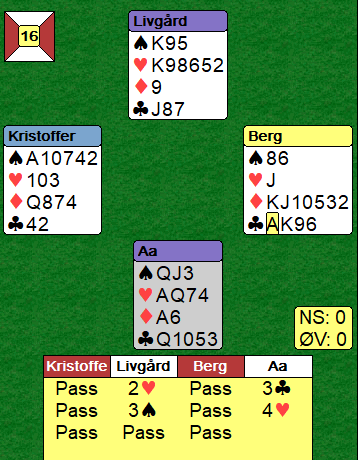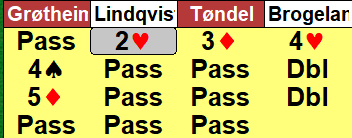 Tormod (N) åpnet med 1 hjerter og Bjørn Brovold (Øst) gikk innpå med 2 kløver, god hånd men ikke helt egnet for opplysende dobling med bare 3- kort spar. Pass fra Eva Eriksen (Syd) og Hans Petter Brynildsen (Vest) valgte å melde 2 grand som ble siste bud.