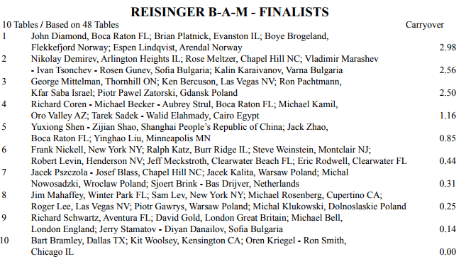 Etter første dag ledet også lag DIAMOND med det norske paret, og på 4.plass lå det helnorske laget Aa-Livgård-Tøndel og Grøtheim (lag Aa). Men listen som ble presentert i bulletinen og gjengitt her i bloggen ble endret senere pga. score korreksjoner. Det førte til at etter kvalifiseringen hvor 20 lag gikk videre til dag 2 lå DIAMOND og det norske laget på delt førsteplass! Link til informasjon om den historien (bridgewinners) finner du her.
