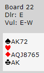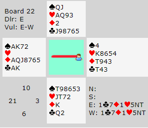 Madammen på vests plass spurte meg om hvordan hun skulle ha meldt storeslem. Jeg kunne berolige henne og si at "du skal være fornøyd med å melde lilleslem i sånne spill". Og ganske riktig, å notere +1390 ga 77% til Ø/V.