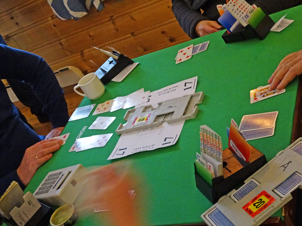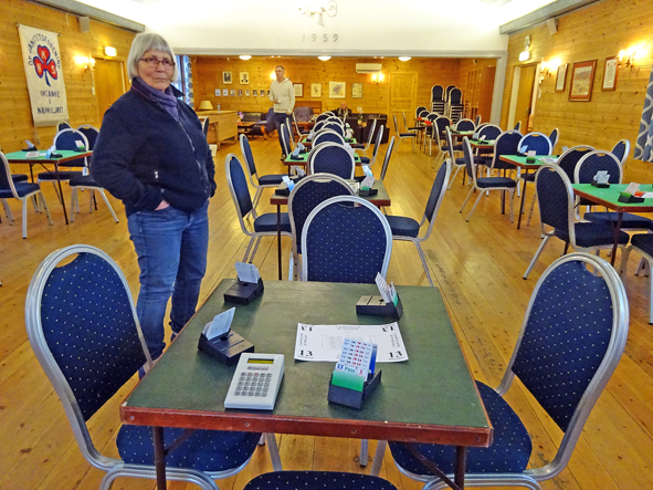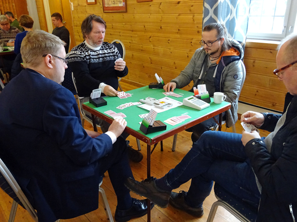 Stilig med bridgebord over heile salen. Gunnveig Wetteland var ein av dei som var tidleg på plass.Takk til Austevoll BK for lånet og god hjelp.