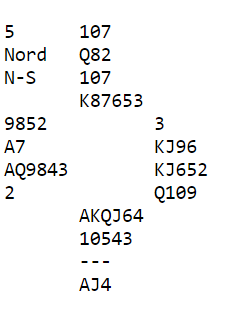 Nord har unektelig en god hånd, men kun 11 hp. En slik 6-4 fordeling er dog veldig spillesterk. Det hadde vært en klart sterkere hånd om nords sidefarge hadde vært sterkere, for eksemepel om han satt med ruter ess i stedet for hjerter ess. Det er klart at syd må ha nokså riktige kort for å kunne dekke opp nok av alle nords potensielle minortapere. Om syd har helt feil kort, for eksempel AJxx - KQJx - Jxx - AK (19 hp) er det bet i 5 spar! Men nord kan antagelig ikke være så pessimistisk. Mange rett og slett sa 4 grand som Key Card Blackwood. Kanskje en bedre melding er 5 hjerter som cuebid for å fortelle at ingen minorfarge er stoppet med nord sine kort. Da vil syd melde slemmen. Om nord velger å spørre med 4 grand får han vite om to Key-Cards, og da må han som en konsekvens også melde slem. Slik så hele spillet ut: