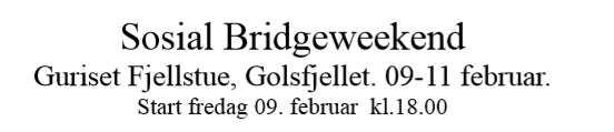 Vi skal spille 8 tirsdager utover, og alle kvelder gjelder i klubbmesterskapet. Hvis paret av en eller annen grunn ikke kan spille en tirsdag blir paret tildelt 40%. Det kan stilles med en vikarierende spiller hvis én i makkerparet er borte en tirsdag.
