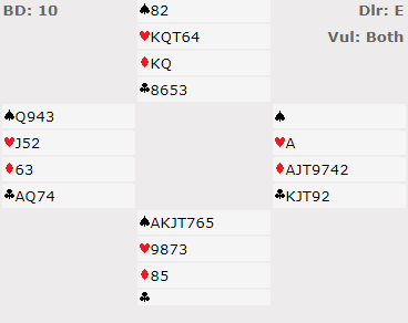 Lilleslemmen var nedlegg, men meldt kun ved ca. 20% av bordene. Ved det andre bordet hoppet syd til 4 spar (som jeg mener er riktig melding med så god langfarge og 7-4 fordeling), og da det deretter gikk pass-pass-5 kløver ver det ikke fullt så lett for vest å lette til 6 kløver, for nå har kanskje åpneren strukket seg mye mer for å melde 5 kløver enn ved vårt bord, hvor han hoppet til 5 kløver og kunne ha sagt bare 4 kløver som også må innebære gode kort. Vest tenkte seg om og passet, og da er det svakt av nord at han doblet 5 kløver. Kanskje burde vest redoblet? Han gjorde ikke det, og de noterte seg for +950 for 6 kløver med ett doblet overstikk, men det var tapt spill med 9 IMP.