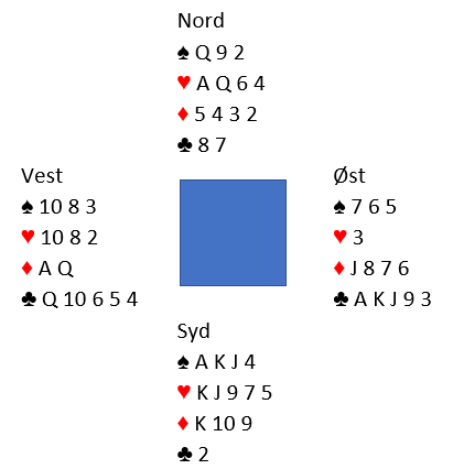 Syd var altså i 4 hjerter. Vest spilte ut kløver 4 til østs konge. Øst forsøkte esset i andre stikk, og syd stjal.