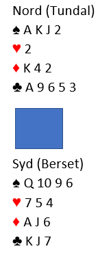 Slemmen er knallhard, og det skyldes nok at syd meldte litt som om han hadde stjålet kortene da han sa 3 spar. Etter 1 hjerter og 3 hjerter fra Ø/V liker han dog kortene sine, alle poengene er i de tre fargene som må dekkes opp, og makkeren har nokså sikkert singel hjerter.