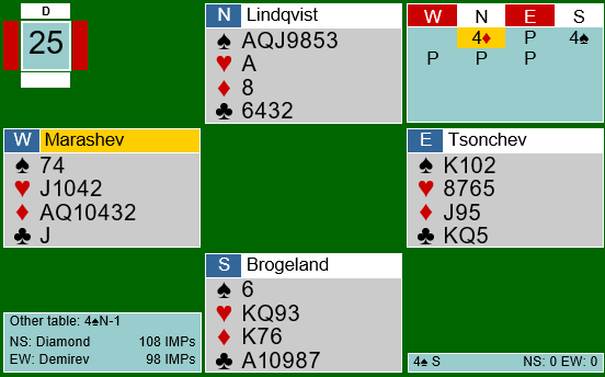 Lindqvist (nord) åpnet med 4 ruter som for dem viser en god 4 sparåpning, så det ble syd som ble spillefører i 4 spar. Vest spilte ut kløver knekt. Hvis syd vinner det stikket blir det bet med to kløvertapere, en spar- og en rutertaper. Brogeland fant et fint trekk da han lasjerte utspillet, et uvanlig trekk når den utspilte fargen er en sidefarge hvor spillefører og blindemann har ni kort! Det fungerte godt siden vest hadde ruter ess. Han skiftet til hjerter, men da spilte Brogeland simpelthen spar ess og spar dame. Vest hadde da ikke flere trumf og kunne ikke få kløverstjeling, og øst kunne ikke få tak i ett stikk til i kløver da to kløver hos nord kunne kastes på hjerteren, +420.