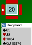 Brogeland passet, men da nord åpnet med 1 ruter og syd sa 1 hjerter etter pass fra øst gikk han innpå med 2 kløver! Nord sa 2 ruter og Lindqvist løftet til 3 kløver som Brogland fikk spille. Den kontrakten gikk tre sonebeter, men det var et godt spill da N/S hadde mistet sin 4-4 tilpasning i spar, og de kunne vunnet utgang. Ved det andre bordet vant N/S +620, 8 IMP til DIAMOND.