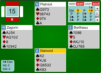Mot Røn og Fredin spilte Espen Lindqvist 3 kløver som øst og fikk ti stikk, +130. Zagorin og Bertheau hadde større ambisjoner og endte i an sprek 5 kløver. Den går normalt bet, og det er vel også bet om syd finner spar ut. Da det ikke skjedde fikk Bertheau fatt i elleve stikk pga. den veldig snille hjertersitsen. En finesse i fargen og en stjeling på østs hånd godspilt enda ett stikk i hjerter og det ble kun to trumftapere! Pluss 400 til ZAGORIN var nok til å smette forbi og ta en liten ledelse før de siste femten spillene.