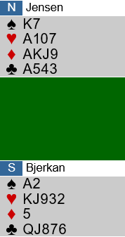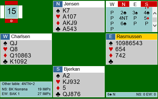 Nord giver i gunstig sone åpnet med 2 NT, unusual- begge minorfargene,5-5+. Øst har trolig minst lilleslem på egen hånd, men først kan mulighetene sjekkes. Dobling som start fra Øst og Syd prefererte til 3 ruter som gikk pass rundt til Øst som krevde med 4 ruter. Det indikerter minst to farger, etter budene sannsynlig med begge major. Syd doblet fo å vise aksept for ruter og nå kunne jo Vest bare passet, Men da majorpreferanse til spar ble valgt antok nå Øst minst 4- kort spar hos makker og da vil oftest 7 spar stå. Men Syd så det annerledes, for doblingskort kom opp. Nå viste trumffargen seg å sitte 5-0 imot og resultat på gull- given ble -300! Men flere andre fikk hjem lilleslem i hjerter, hele 4 bord og ett med 13 stikk. Hvordan det gikk for seg?