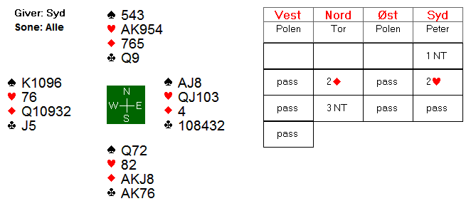 Mot oss åpnet Lars Helgesen med 1 kløver (2+)og Tom Gjøs (Øst) svarte 1 ruter. Vest gjenmeldte 1 hjerter og Øst krevde i spar (hopp til 2 spar). Deretter ble kontrakten altså 3 NT av Vest.