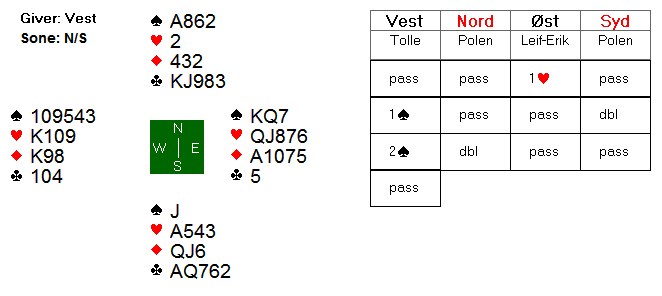 I lukket rom doblet Polen brødrene Stabell i 2 spar. Nord spilte ut liten spar til kongen i øst, som felte knekten i syd.