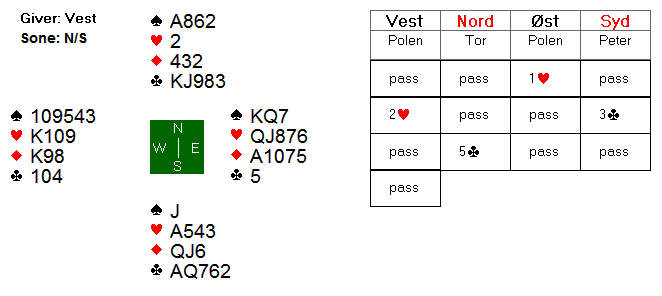 Peter balanserte i 3 kløver, og Tor meldte kanskje litt hardt da han hoppet rett i 5 kløver, men kortene passet perfekt sammen, slik at det kun var to rutertapere. +600 for Norge i åpent rom.