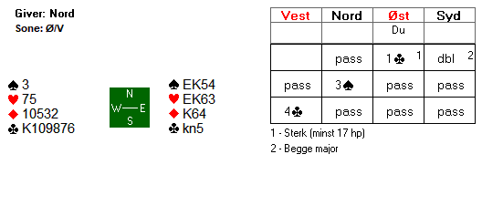 En konvensjon passer utmerket her, såkalt Responsive dobling som ikke er for bet men lover minst to sidefarger der makker helt sikkert har en av dem. Kari Gudmundsen slapp å velge major, 2 hjerter oppfattes av mange som 5- kort og da passer lett Nord. Her kunne Siggen Holden melde 2 spar, og beste tilpasning, 4-4 var funnet. Syd inviterte med 3 spar, men Nord fant ikke tillegg. Men med super heldig sits ble det bare en taper i trumf og 10 stikk. Man brenner lett slike utganger. Likevel god kontrakt!