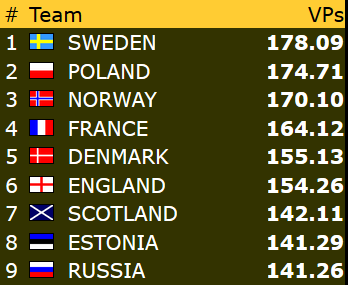 Norge vinner til slutt 44-26 og har i øyeblikket 13,53 VP ned til 4. plassen.