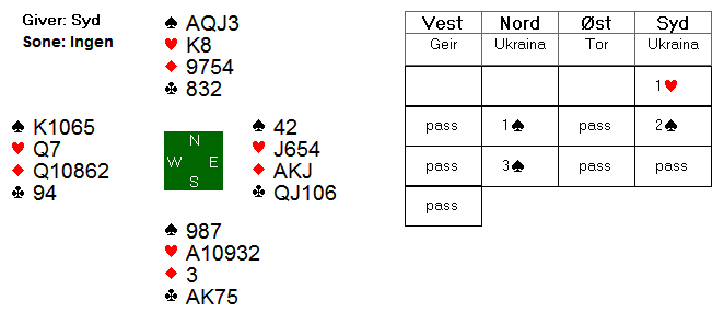 Geir la 10'eren og nord stakk med knekten og fortsatte med en ruter til stjeling. Hjerter ble spilt til kongen etterfulgt av nok en ruter til stjeling. Spillefører tok for hjerter ess og fortsatte med hjerter 10. Vest kastet en kløver og nord kastet sin siste ruter. Øst stakk med hjerter knekt og spilte kløver dame. Spillefører stakk med esset og spilte hjerter 9, som vest trumfet med spar 5 og nord valgte å hive en kløver. I posisjonen under spilte Geir en ruter:
