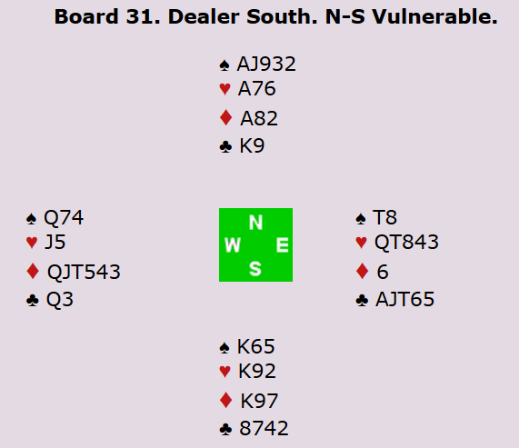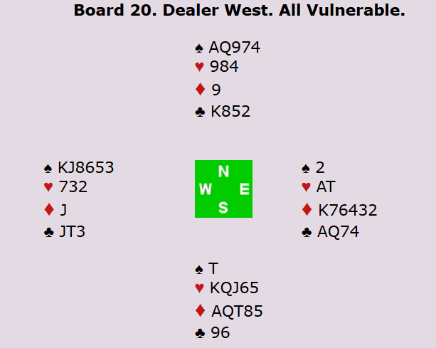 I åpen klasse ble dette et gladspill. Mens Espen og Boye spilte 5 spar i nord med tolv stikk, fikk Allan kjøpe kontrakten i 4 ruter i øst. Der var det kun ei beit, og dermed kan vi notere 10 IMP i den norske kollona. I veteranklassen ble det 9 IMP ut for Norge da nederlenderne faktisk fikk kjøpe kontrakten i 2 ruter. Ved det andre bordet gikk Norge 300 ut i 5 ruter doblet. I dameklassen fikk Norge en firer inn etter at Marianne og Ann Karin fikk spille 5 ruter doblet med 300 ut, mens Gunn Tove spilte 5 spar med elleve stikk.